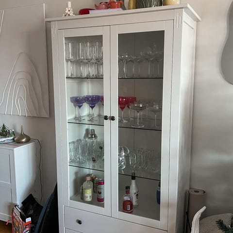 Två ”TRAPPEDAL” vitrinskåp från Jysk