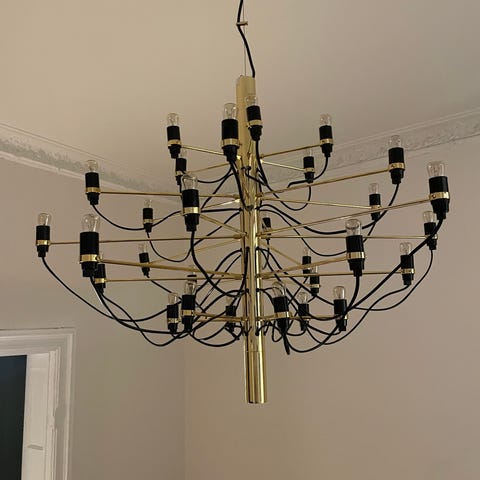 Säljer en elegant och tidlös takkrona från FLOS, modell 2097/18, tillverkad i Italien. En ikonisk designlampa i mässing med svarta detaljer som ger ett exklusivt och modernt intryck.