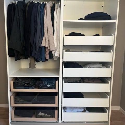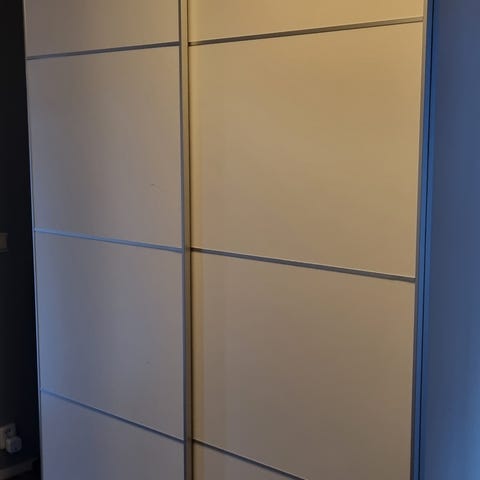 Paxgarderob 150*201*66cm med Hasvik vita skjutdörrar. Välutrustad med 8 lådor. (Bilden visar garderob med 4 lådor) Är nedmonterad. Köpt för två år sedan för 7 000:-