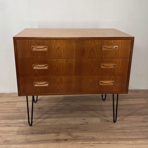 Teakfaner. Sju lådor. Rundade ben i bok. Bredd 101, djup 46, höjd 145 cm.