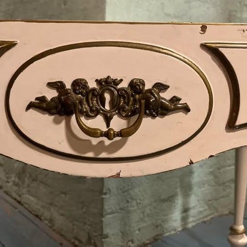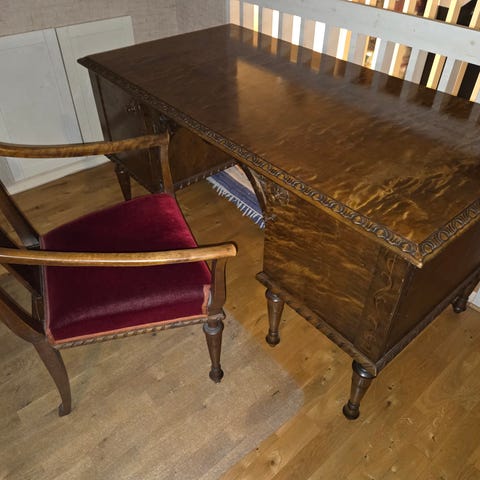 Stilfullt skrivbord i ljus ek. Renoverat för en del år sedan, sparsamt använt sen dess. Det är gjort så att två personer kan använda det samtidigt, med tre utdragslådor på varje långsida, en hurts med utdragslådor bakom dörr, och en hurts med hyllplan åtkomlig från bägge sidor.