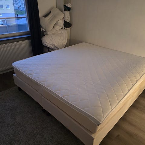 Jysk kontinentalsäng med grått tygöverdrag och stoppad sänggavel, väldigt fint skick och ca 1 år gammal. Medföljer 2 st sängbord samt 2 överkast om så önskas