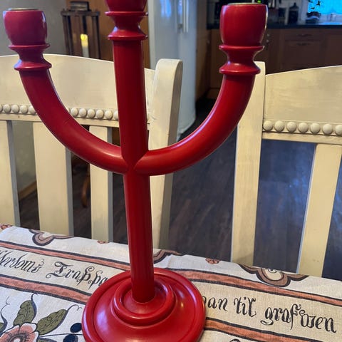 En dekorativ vintage ljusstake i trä med plats för fem ljus. Ljusstaken har en hand målad blomdekor på brun grund med guldfärgade ljus koppar.