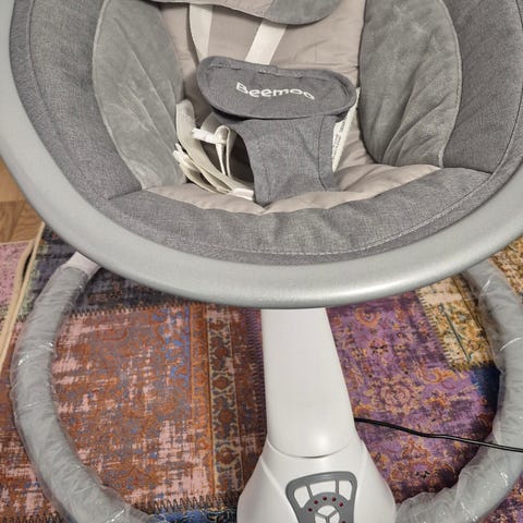 Coco Bloom Baby Lounge i vitt läder på sittytan och mörkt trä i övrigt. Babysittern är försedd med fempunktssele för säkerhet och passar barn från nyfödd upp till 6 månader. Inkluderar bärväska.
