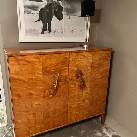 Vackert Art déco-skåp från 30-talet i masurbjörk. Gott skick men använt såklart. Nyckel saknas.
