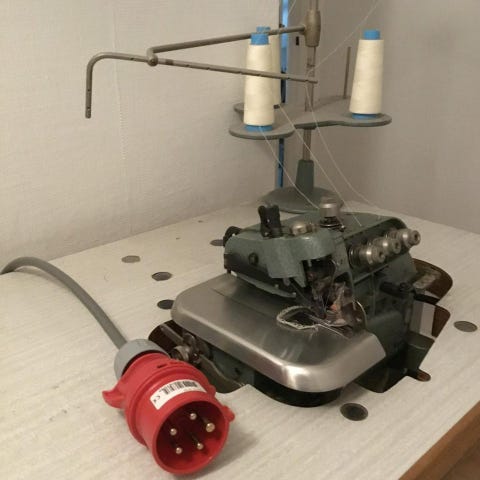 Artisan 734DP overlockmaskin med flera trådspolar och inställningsratten för olika stygnbredder och längder. Maskinen levereras med lite extra tillbehör så som trådrullar, se bild.
