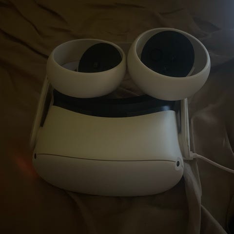 Meta Quest 2 VR-headset med två handkontroller i vitt. Headsetet är designat för virtuell verklighet och används för spel och interaktiva upplevelser. Kontrollerna har knappar och spakar för navigering och interaktion i VR-miljöer.