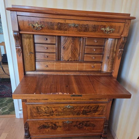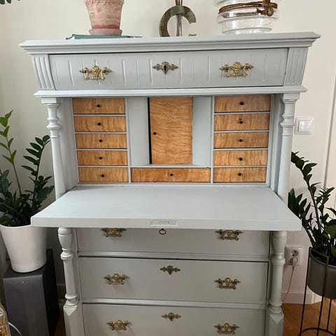 Säljer en vacker äldre byrå med tidstypisk känsla och fina detaljer. Möbeln har gott om förvaring och en praktisk fällskiva som gör att den även kan användas som skrivmöbel eller avlastningsyta.