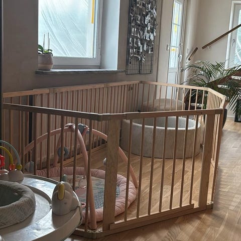 Lekhage i trä med hjul – höj- och sänkbar botten 👶🪵
