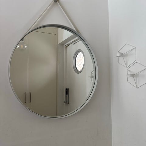 IKEA YPPERLIG rund spegel med hylla i vit färg. Kollektion med Hay. Spegeln har en rund form och är försedd med en liten hylla nedtill. Passar för användning i exempelvis hall eller badrum.