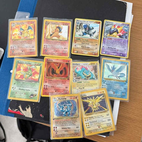 säljer nu min barndoms pokemon kollektion då jag inte ser intresset av att samla mer. går o köpa styck vis eller allt för ett bättre pris. nästan allt är i perfekt skick men några är lite kant skadade. de flesta går att skicka in på gradering mestadels dem som ligger i graderings sleeve dem är 0 skada och potensial till psa 10!
