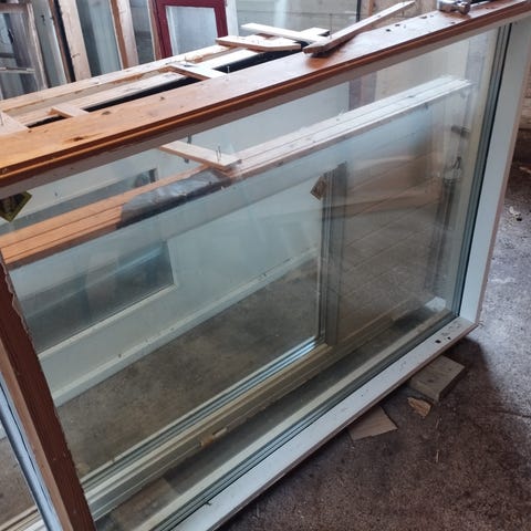 2 st glaspartier säljes, 4-delade med glasdelande poster, den lägsta delen med tät fyllning enligt bilder. Av klarlackad björk. Ej säkerhetsglas, så vitt jag vet. Karmdjup 95mm.