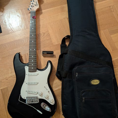 Gitarren har bara använts ett fåtal gånger och det ingår en förstärkare från Fender, kablar, rem och fodral.
