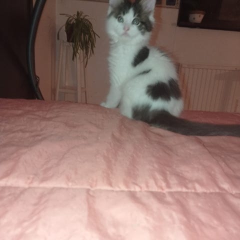 Han är 75 % Maine Coon och 25 % vit huskatt. Det syns tydligt på hans tjocka, mjuka päls, stora tassar och gulliga “teddy-look”. Han har en vacker vit grundfärg med mörkgrå/svart teckning på huvudet, öronen och svansen – väldigt iögonfallande.