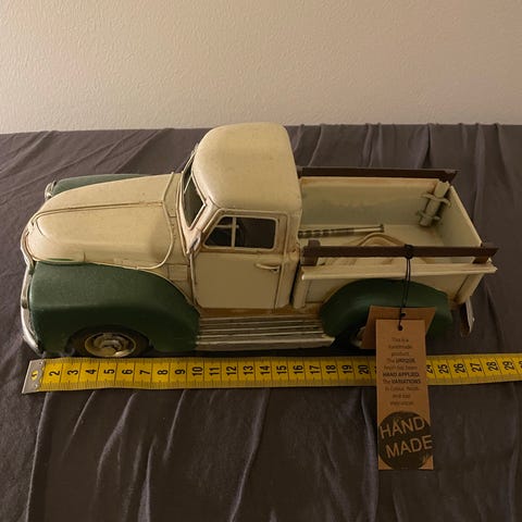 Detta är en dekorativ modell av en brandbil, sannolikt tillverkad av metall. Den är röd med gula detaljer. Liknande modeller är cirka 31-42 cm långa. Den har detaljer som stegar och slangarullar. Den är avsedd för dekoration snarare än som en leksak.