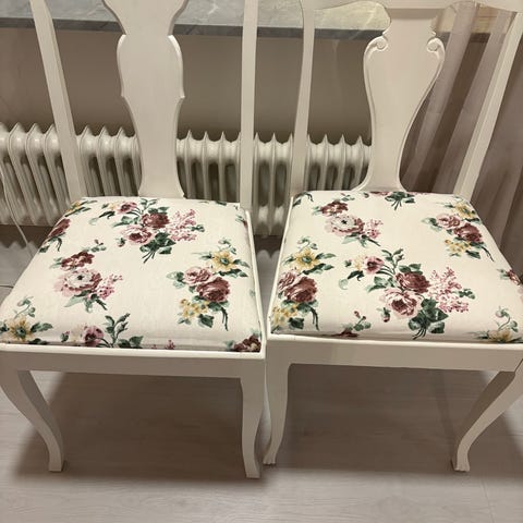 Omgjorda stolar. Från början träfärgade. Nu är de 2 st rosa och 2 mintgröna. Klädseln är bytt. Kan va ngt skav på färgen på enstaka ställen på stolarna.