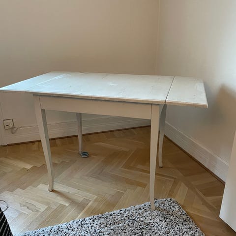 Matbord från IKEA klaffbord samt stolar från Jysk. Inköpt för 6 mån sedan. Nypris för allt 2700kr. Säljes gärna som ett paket men även byte mot en 3 sits soffa med divan är av intresse. (Grå soffa helst). Prisade för allt 1800kr. Priset kan ev diskuteras vid en snabb affär. Vh Per