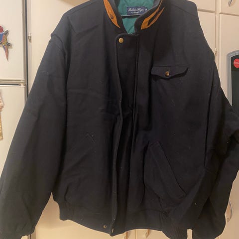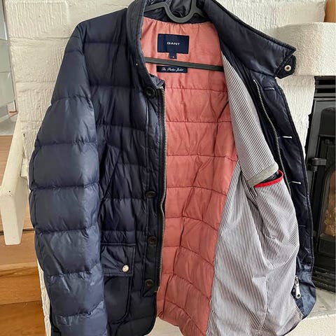Jackan är i mycket gott skick utan några som helst skador eller slitage. Den har den klassiska GANT-logotypen diskret placerad på bröstet och ett elegant randigt innerfoder som är typiskt för märkets höga kvalitet. Den fungerar lika bra över en skjorta till jobbet som till en mer avslappnad stil på helgen.