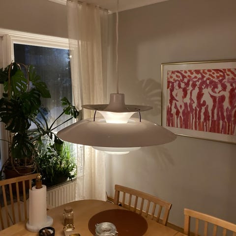 Lampan är känd för sin karakteristiska form och skärm i flera lager som ger ett diffust och bländfritt ljus. Passar för inomhusbruk och kan användas som taklampa i olika rum.