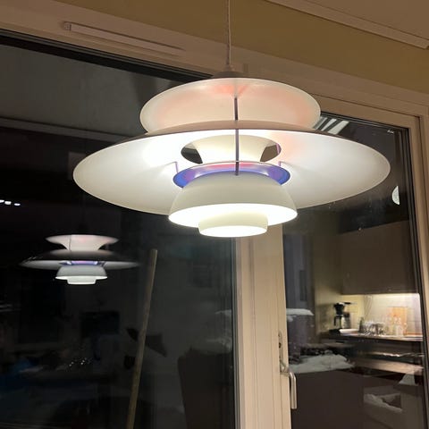 Louis Poulsen PH-lampa designad av Poul Henningsen. Vit med blå detaljer. Ca 50 cm i diameter.