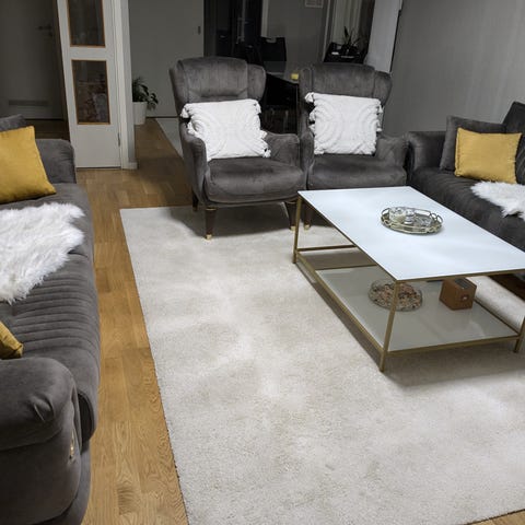 Det extra höga bordet (120 × 70 × 65 cm) med svart härdat glas gör att gruppen även fungerar utmärkt som matplats – plats för upp till 8–9 personer. Två sittpuffar ingår.