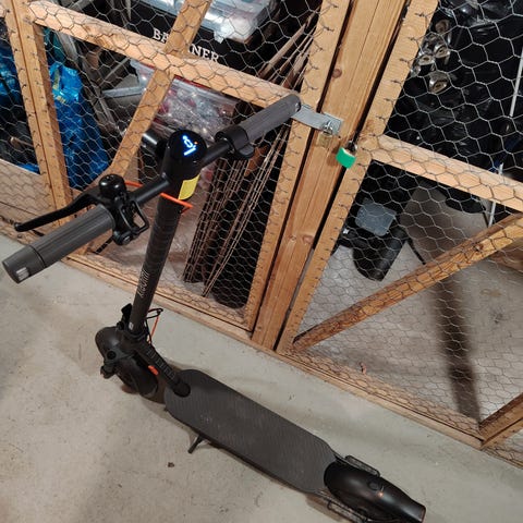 Elscooter i svart färg, Utrustad med handtag för styrning och digital display för information. Designad för personligt bruk och transport.