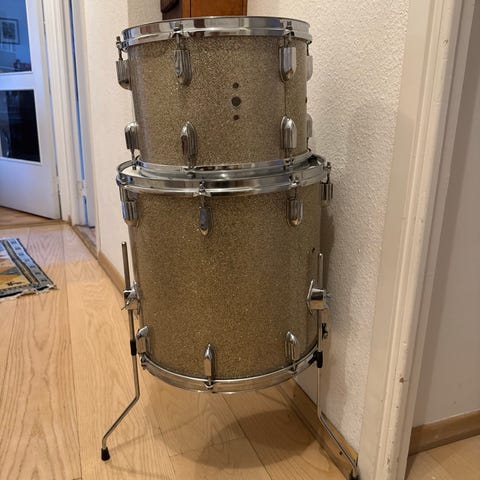 Trumset bestående av bastrumma, virveltrumma, två pukor, en golvpuka, en ride cymbal, hi-hat och trumstol. Bra skick