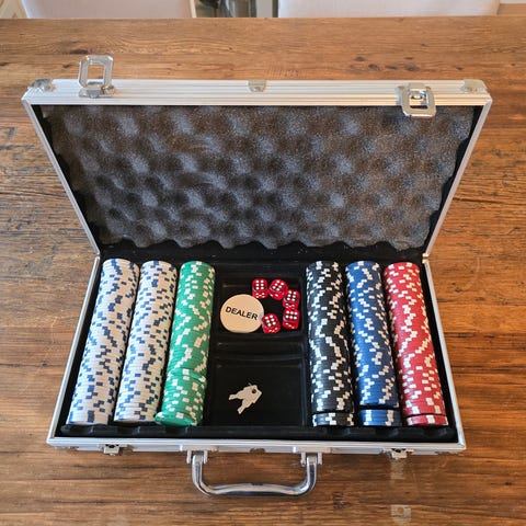 Pokerset med 300 marker i olika, kortlekar, tärningar och dealer-markör. Allt i en väska.