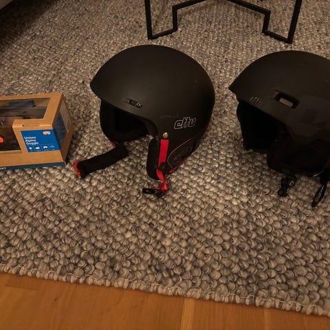 Har en vit skidhjälm, sparsamt använd, i gott skick.