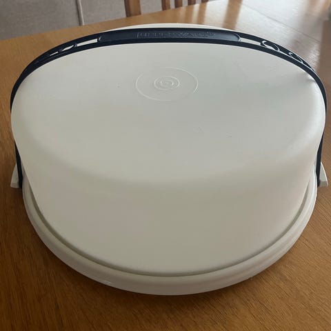 Stabil tårtlåda för säker förvaring och transport av tårtor. Diameter 34 cm, höjd 15 cm, med blått handtag