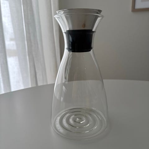 Eva Solo kylskåpskaraff med en volym på 1,0 liter. Karaffen är tillverkad i glas och är avsedd för förvaring av drycker i kylskåp. Nypris 599kr. Hämtas i Vasastan eller centralt i city