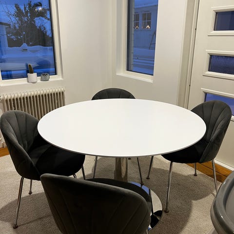 Bordet har svarta ben med marmor liknande design på. Stolarna (6st) svarta med med grått tyg.