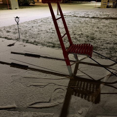 Grön pulk. Pulkan har metallstavar som skenor och en sittdel av trä. Passar för vinterlek och transport på snö. Vuxen spark