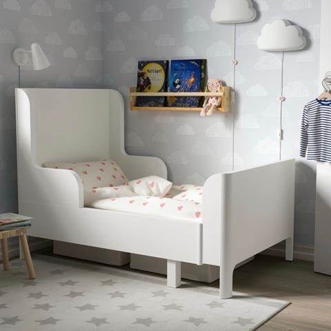 IKEA utdragbara sängar för barn. Sängen är vit och har två utdragbara sängar samt förvaringslådor under. Passar för barnrum och kan användas för att spara plats genom att dra ut den extra sängen vid behov.