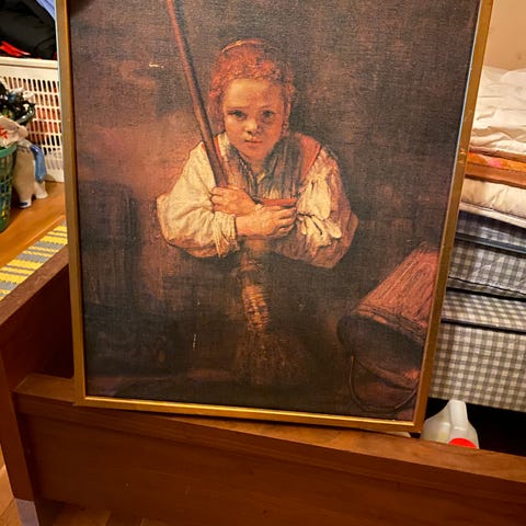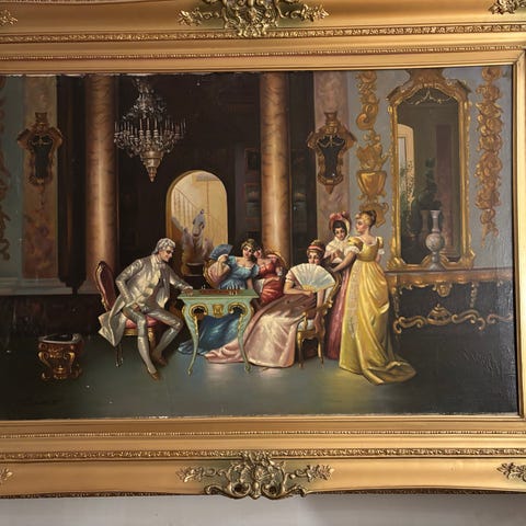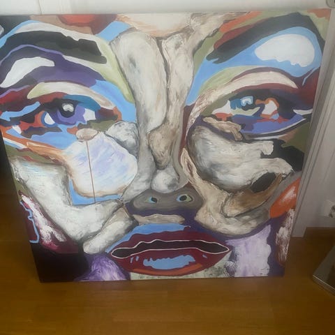 Oidentifierad konst tavla med motiv föreställande Moder Maria. Tavlan är monterad på en spänd duk med träram. Färgerna är främst gröna, gula och hudtoner. Passar för inredning och dekorativa ändamål.