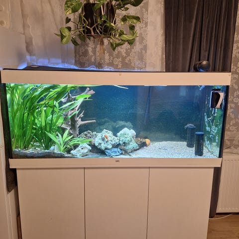 Det är nu dags för mig att sälja mitt fina akvarium. Jag har helt enkelt tappat intresse för det. Akvariet säljs i dess helhet. Med alla tillbehör. Tillbehör som finns är mycket inredning, stenar, buskar, rötter, grottor mm. Det finns massor med mat samt en del vätskor. Det finns ett in and out set som du kan koppla till din kran så att du slipper bära på hinkar vid städning. Hinkar finns också naturligtvis. Droppvärmare och pump finns. Led-belysningen är nyköpt. Har säkert glömt någonting men det är bara att fråga om ni undrar någonting. Bärhjälp finns ej.