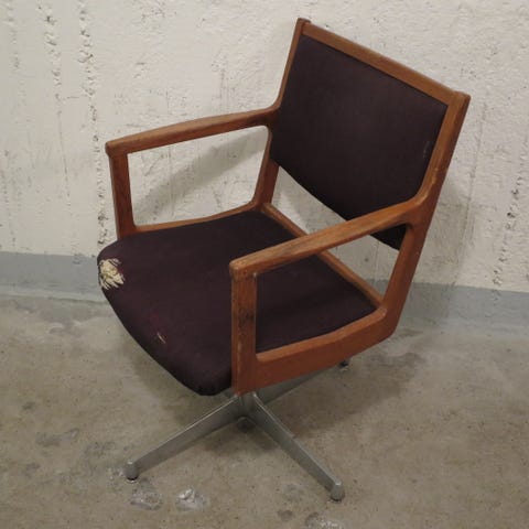 Bekväm snurrfåtölj i varm rödorange ton med ben i teak. Tydlig 60/70-talskänsla och skandinavisk design. Stabil, bekväm och i fint skick.