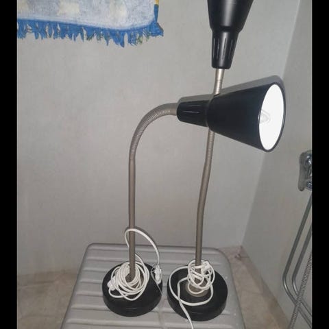 Säljer två eleganta bordslampor med modern geometrisk fot i krom med en beige lampskärm. Fint skick och fullt fungerande.