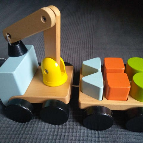 Fin gedigen kranbil i trä med släp med sex klossar i olika former som kranen kan lyfta med magnet.
