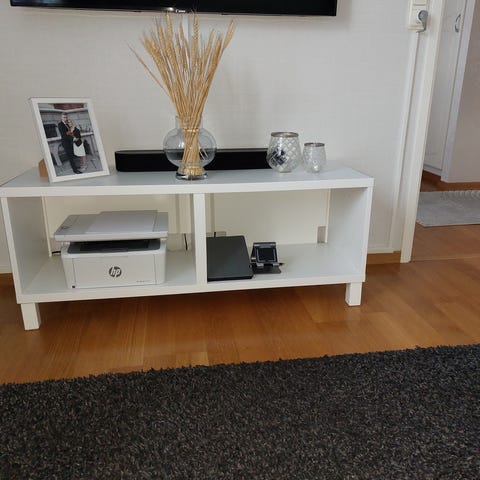 Jysk TV-bänk i vitt med tre dörrar och ben i trä. Möbeln har en hylla inuti för förvaring och är avsedd för vardagsrum eller liknande utrymmen.