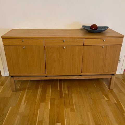 Byrå i trä med fyra lådor i mitten och två skåp på vardera sida. Möblerad med metallben och en naturlig träfärg. Passar för förvaring i olika rum.
