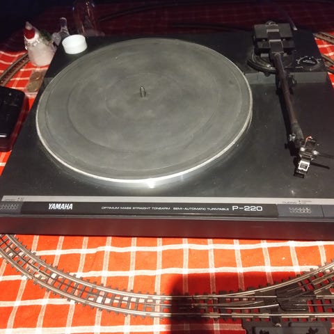 Yamaha P-05 skivspelare med silverfärgad yta. Tillverkad av Nippon Gakki Co., Ltd i Japan. Utrustad med standardarm och plattform för vinylspelning.Saknar lock och drivrem.
