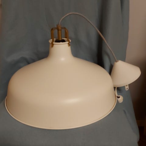 Säljer en snygg taklampa med svart, lätt transparent tygskärm. Ger ett behagligt och mjukt ljus, perfekt över matbordet eller i vardagsrum. Stilren design som passar de flesta hem.
