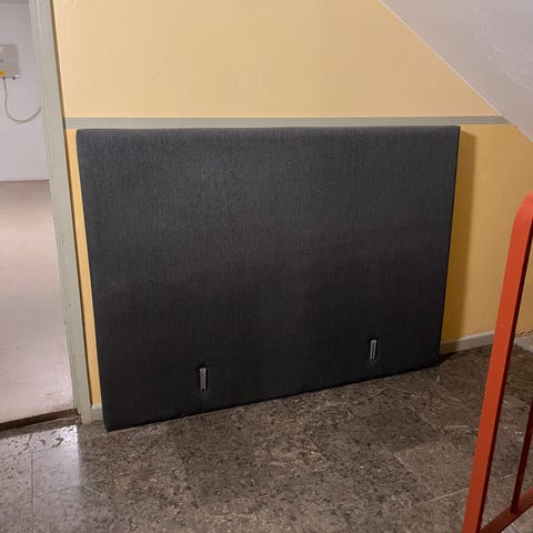En fin sänggavel i grått från Mio. New York heter serien. Gaveln passar en 160 säng (står på bilden vid en 120 säng…).