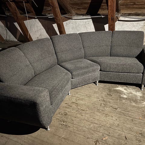 Soffan är i mycket gott skick. Benen är i ek och sittdynorna är löstagbara. Soffan går att montera isär. Soffbordet är i massiv ek och mäter 75 x 75 cm med en uppfällbar klaff som mäter 30 cm. En tidningshylla under bordet.