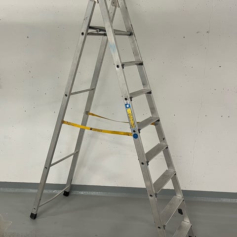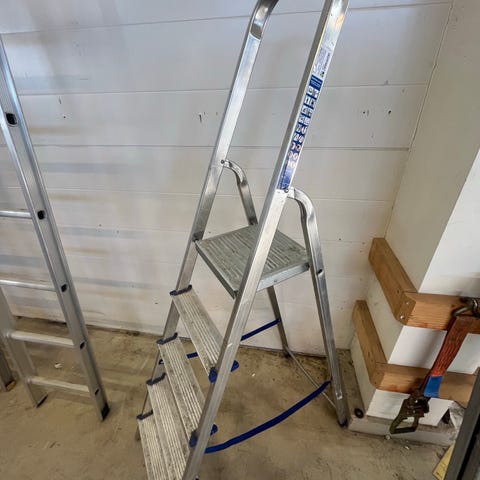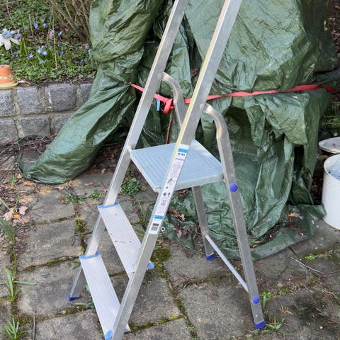 Trappstege i aluminium. 5 steg och plattform överst. Bra funktionellt. Färgspill finns. Hopfällbar.