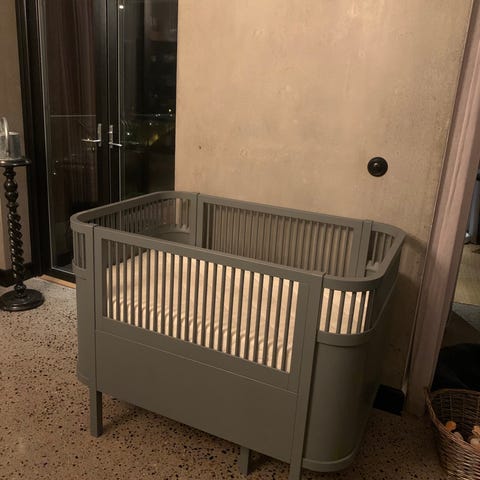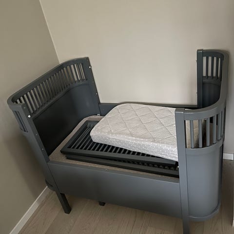 Bottenplattan kan höjas för att underlätta under de första månaderna, sedan sänkas till spjälsäng där barnet kan stå utan att ramla ut. Dessutom kan den sedan dras ut till en juniorsäng på 155cm och kan då användas upp till 6-7års ålder. Fräscha sköna madrasser medföljer. Madrasskydd har alltid använts.