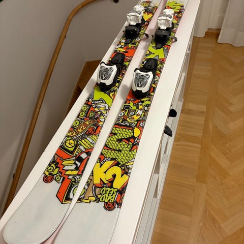 K2 Juvy Twintip 109. Köpta förra säsongen och använda endast en säsong. Mkt bra skick. Grymma bindningar (Marker 7.0). Pris 900kr