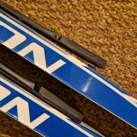 Skidorna är väl använda och det syns på ovansidan (repor och märken finns). Belagen är i relativt gott skick.