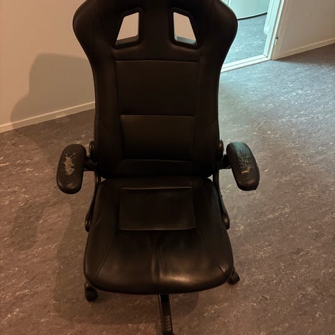 Säljer en gamingstol från JYSK i svart/grön design. Stabil och bekväm stol med hög rygg, armstöd och hjul – perfekt till gaming eller skrivbord.